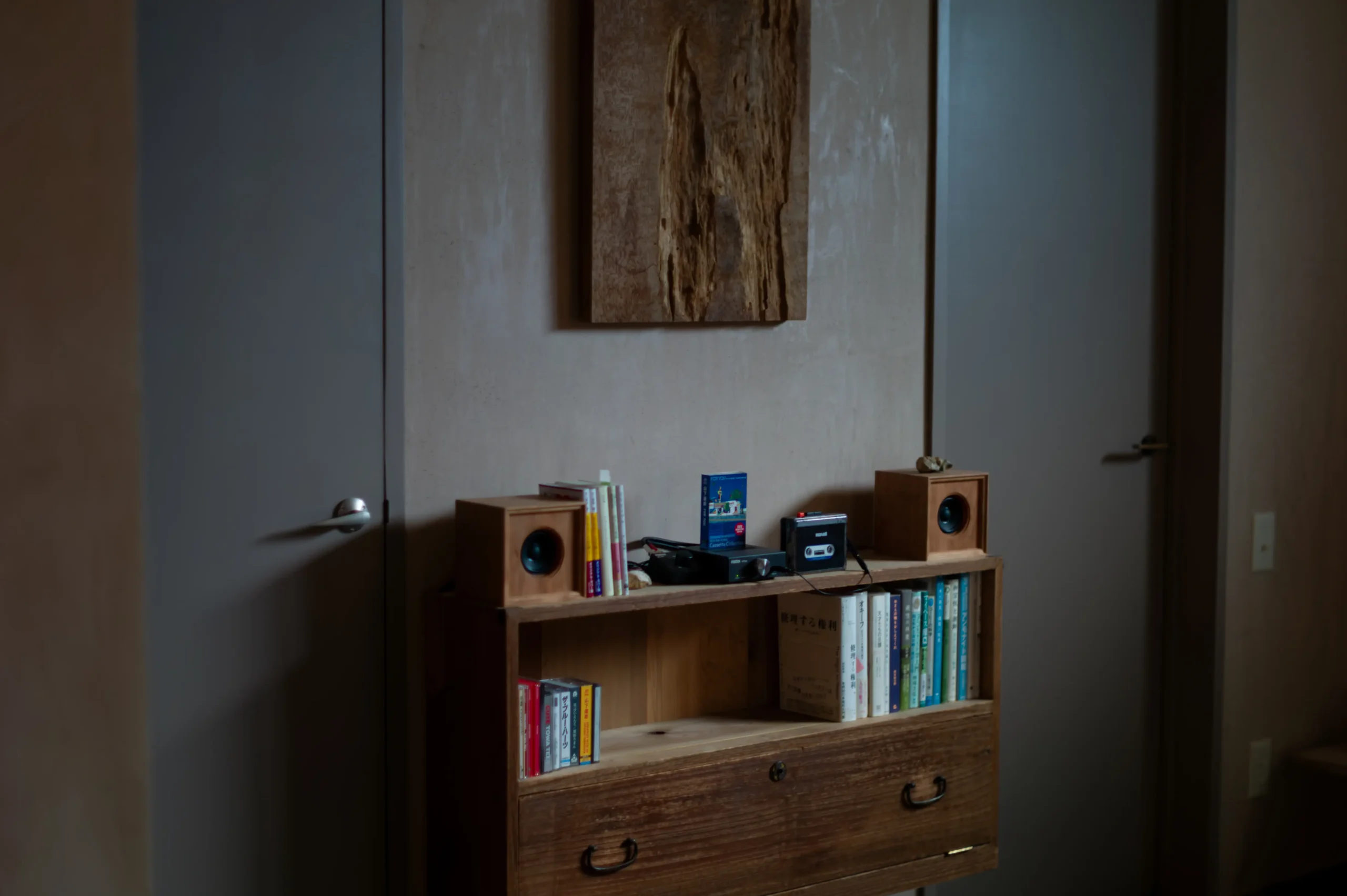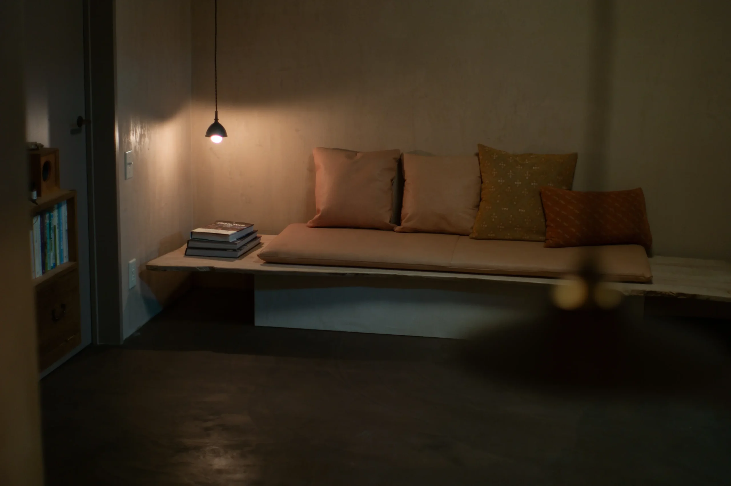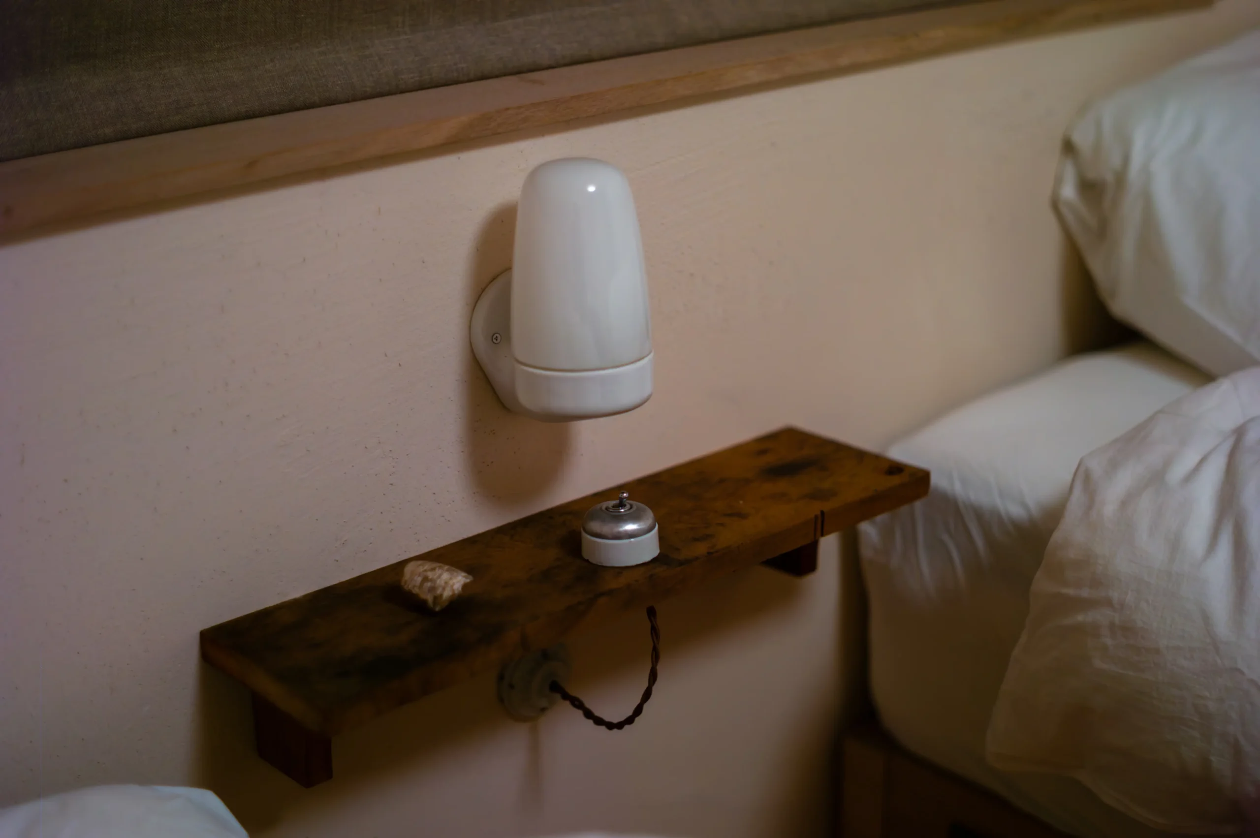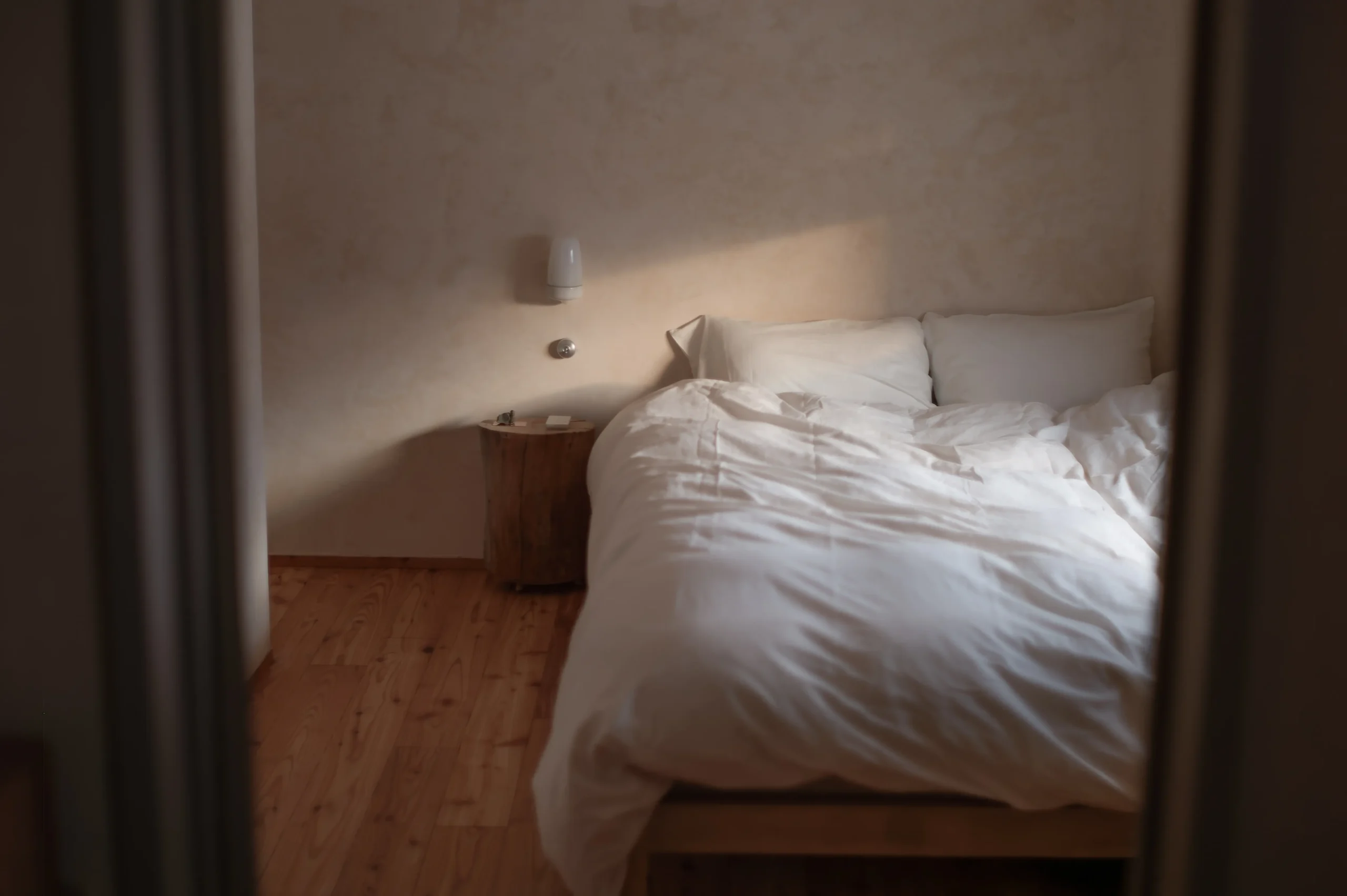 ツイン同様、中川町産のタモ材を「浮造り」で仕上げた造作ベッドを備えています。 枕元の丸太スツールは、古材の梁から制作した一点もの。 壁面は「半磨き」の漆喰。淡い色をベースに濃淡の2色を加えた、三層の奥行きのある表情に仕上げてあります。 床は道産のカラマツ材をオイルフィニッシュで仕上げ。Wilhelm Wagenfeld氏のランプが、静かな夜を灯します。
