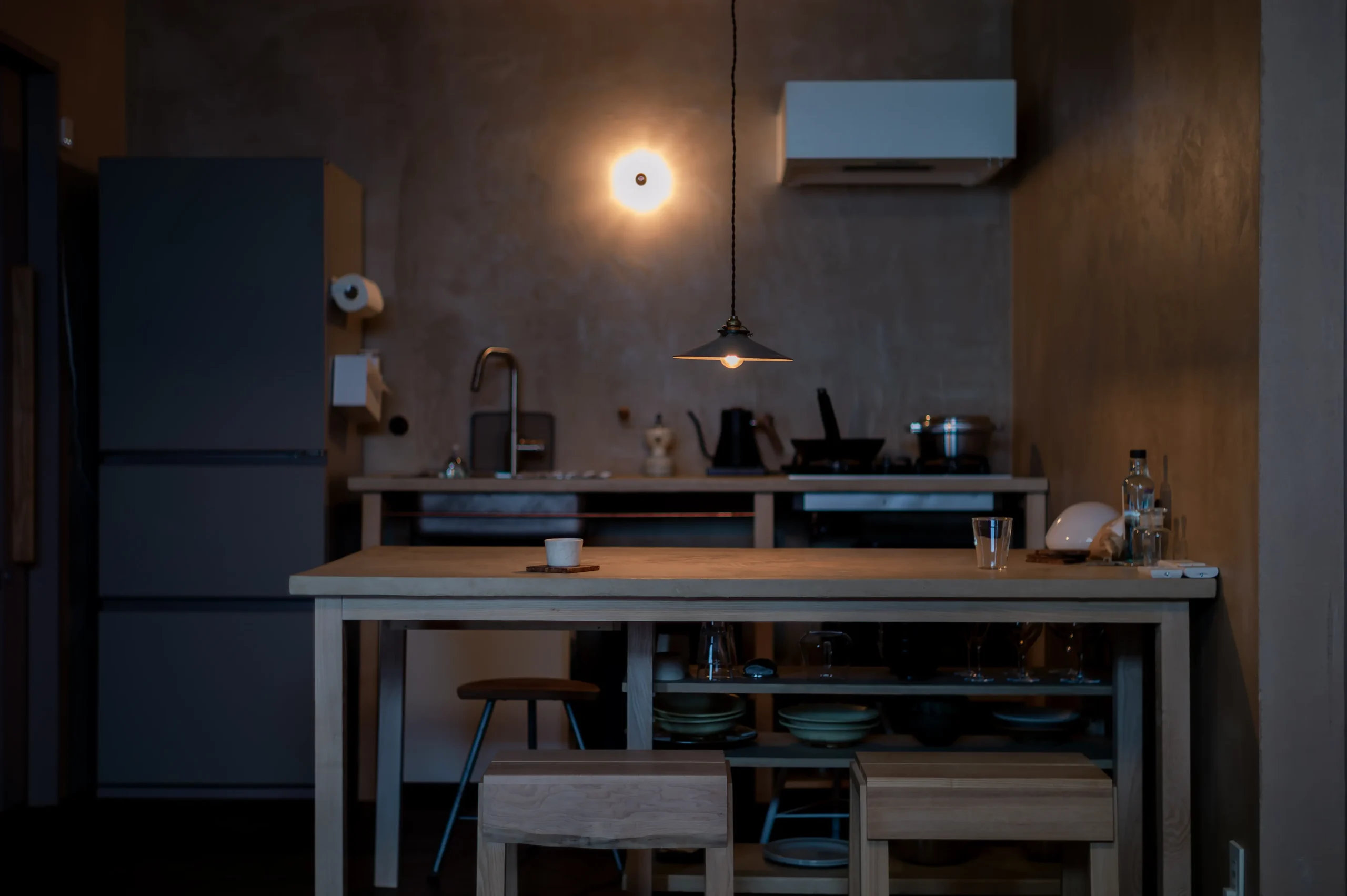 地元の食材を自由に楽しめる、シンプルながら機能的なキッチン。 中川町産のタモと石のような質感の天板。アナログだけど使い心地の良い道具たち。 旅先で淹れるコーヒーや、静かな朝食の時間をお楽しみください。
