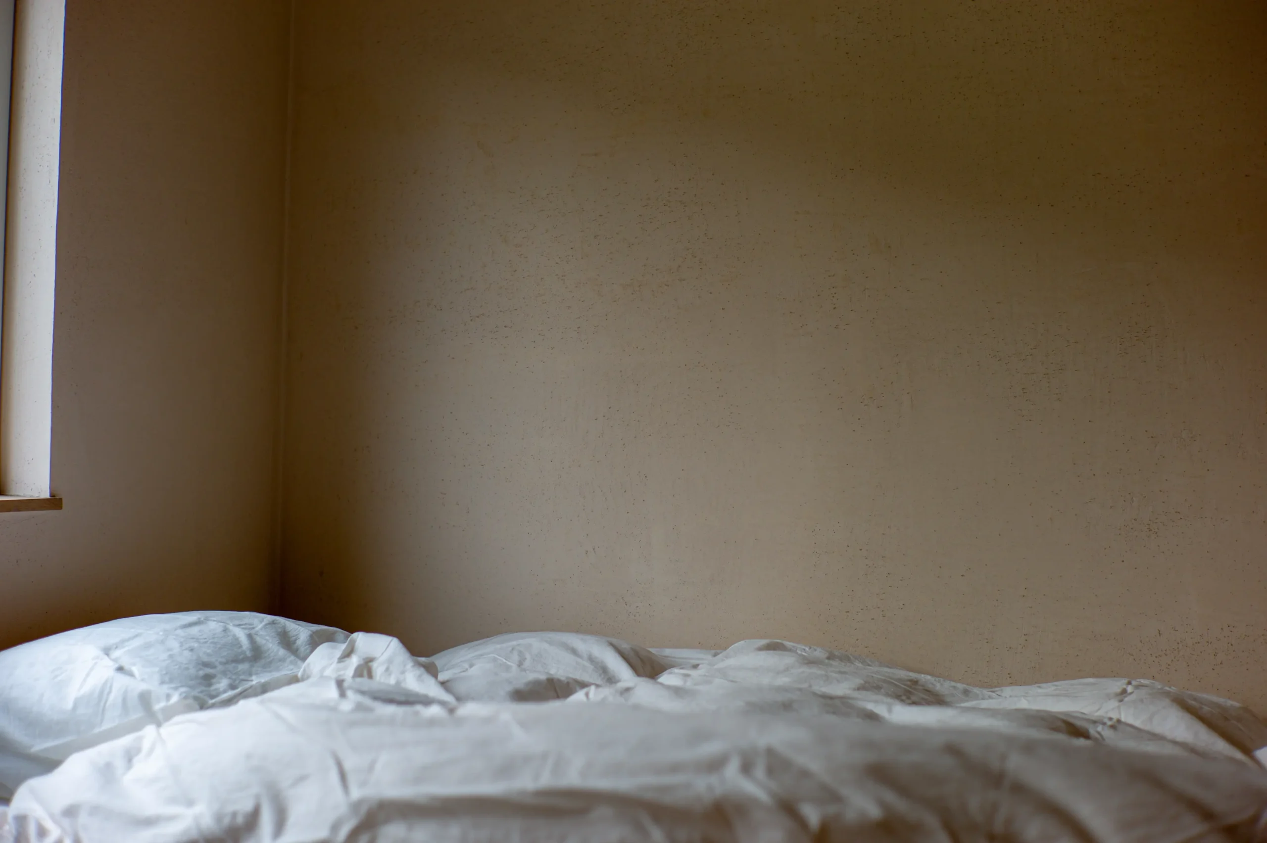 造作ベッドは、中川町産のタモ材を「浮造り(うづくり)」という手法で仕上げ、古材のような素朴な風合いを持たせました。 壁面は、3種類の砂をブレンドして調整した、淡い色の砂漆喰。 床は道産のカラマツ材をオイルフィニッシュで仕上げてあります。 枕元のランプは、ドイツのデザイナー Wilhelm Wagenfeld氏による1960年代のヴィンテージ作品です。
